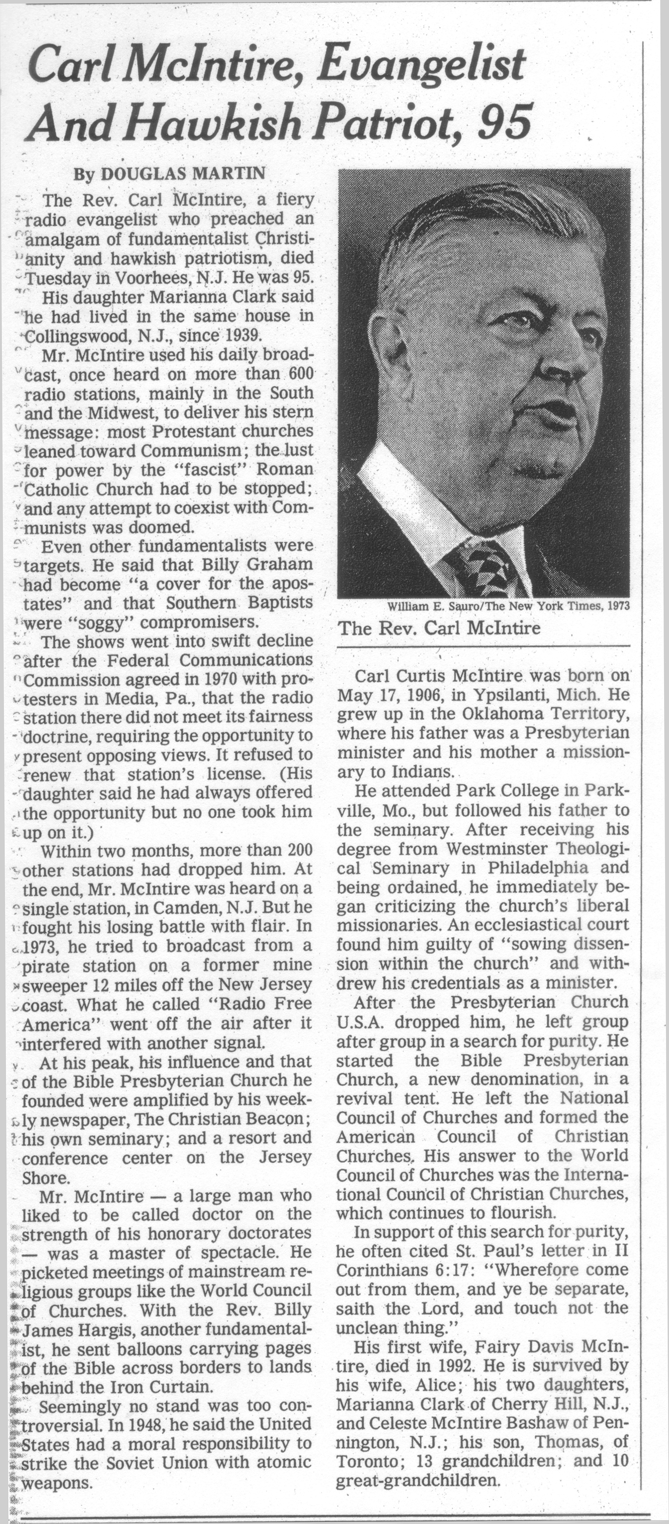 New York Times, March 22, 2002: “Carl McIntire, Carl McIntire, Evangelist And Hawkish Patriot, 95”