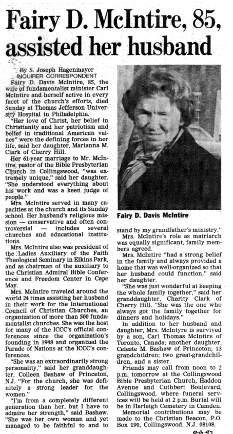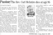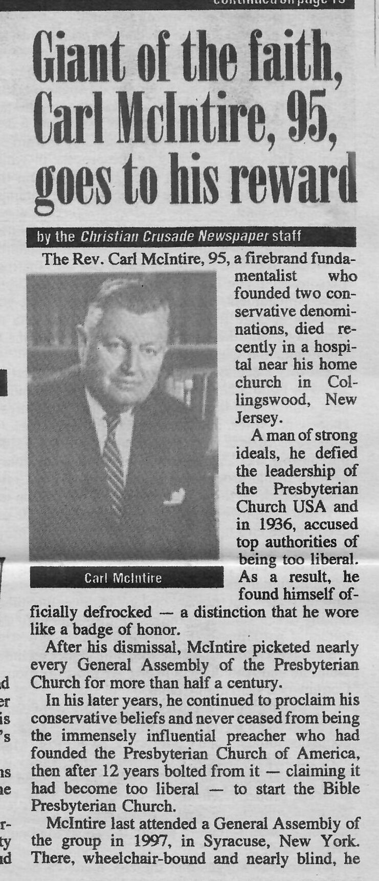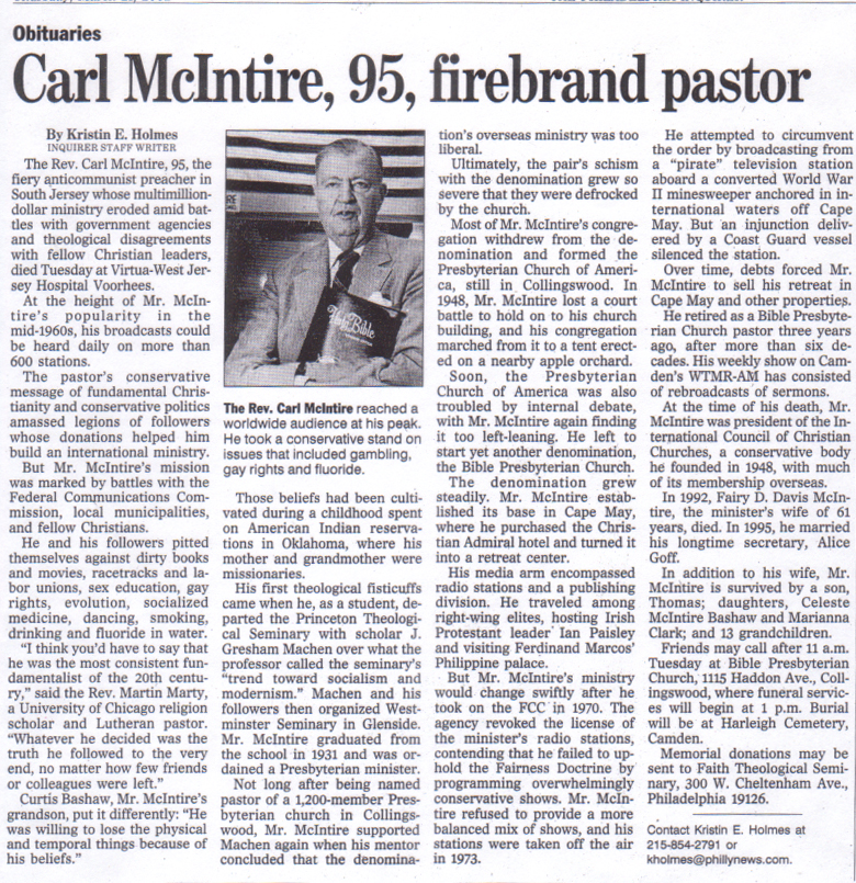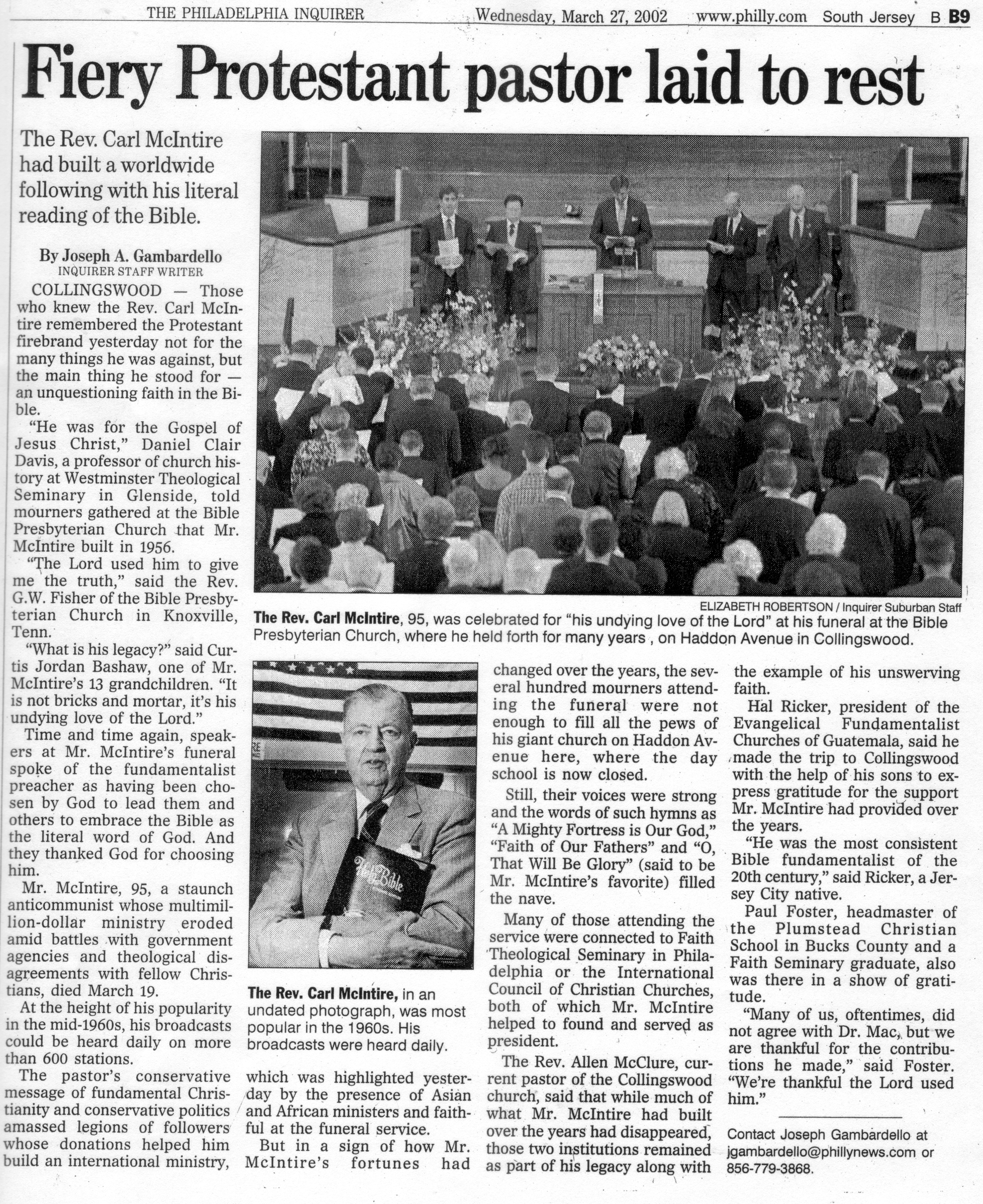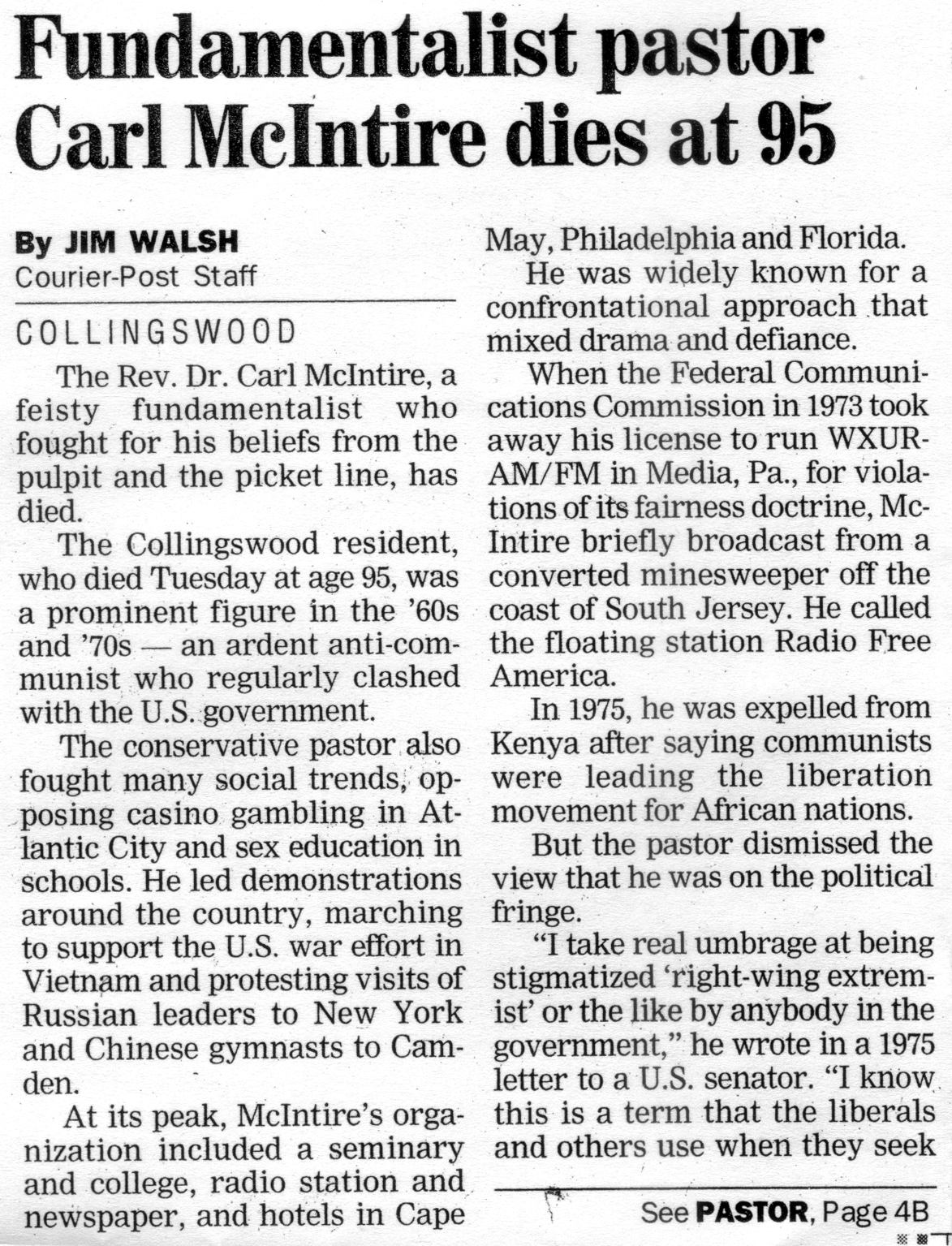 Courier Post, March 22, 2002: “Fundamentalist Pastor Carl McIntire Dies at 95”
