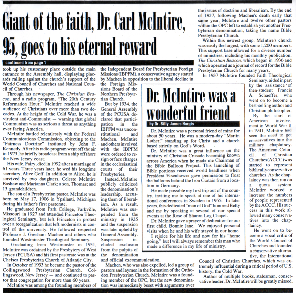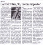 The Chicago Tribune, March 23, 2002: “Rev. Carl McIntire, 95, Fiery Fundamentalist Preacher”