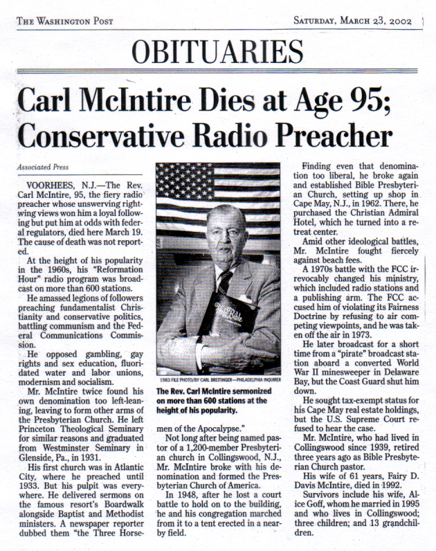 The Washington Post, March 23, 2002: “Carl McIntire Dies at Age 95; Conservative Radio Preacher”