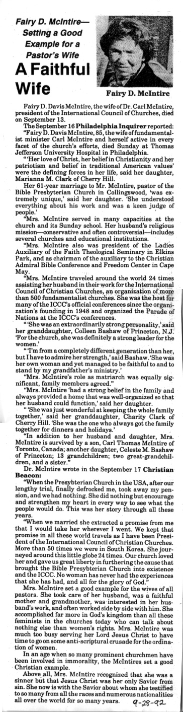 Christian News, September 28, 1992: “Fairy D. McIntire, A Faithful Wife”![]()